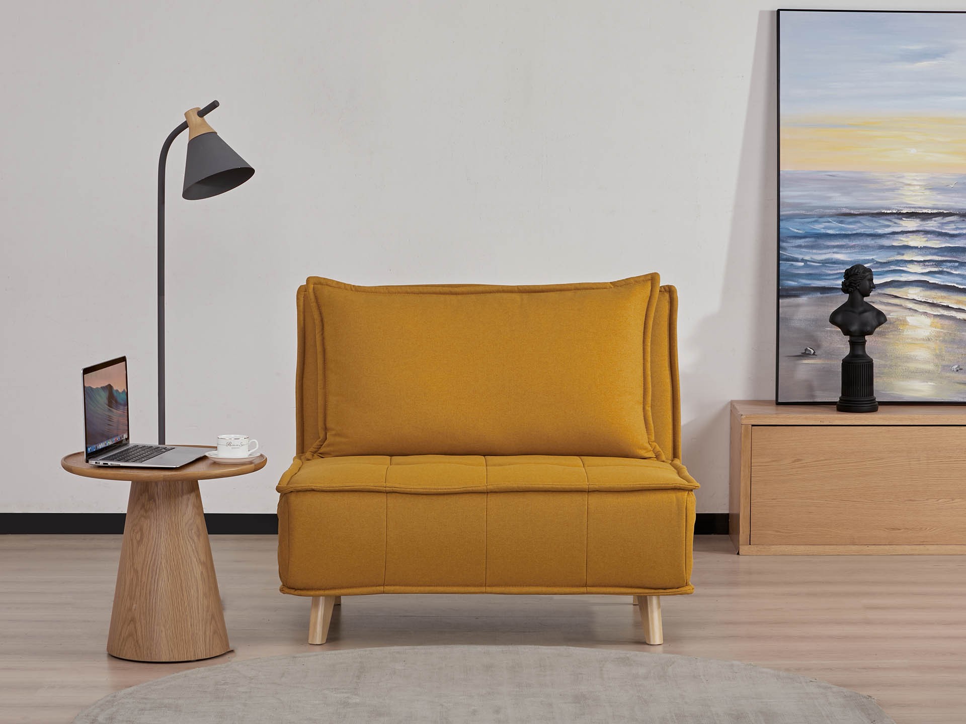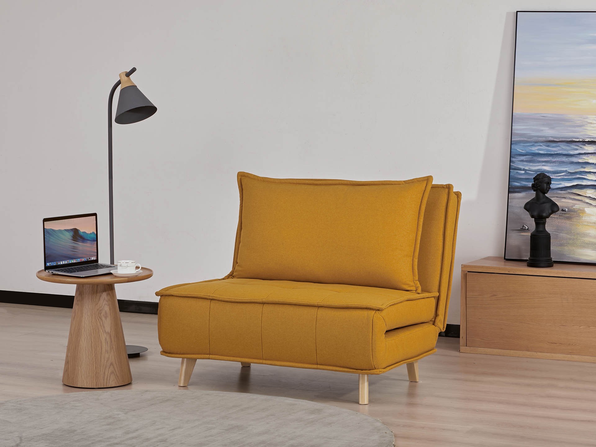 New Ragazzo se destaca por su diseño moderno y su inigualable practicidad, ideal para maximizar el confort en espacios reducidos o recibir visitas inesperadas. Su sencillo y liviano mecanismo permite transformarlo fácilmente en sofá, sillón de relax o cama, ofreciendo tres posiciones perfectas para disfrutar de un descanso pleno. Podes combinar dos unidades para formar una cama matrimonial, lo que lo convierte en una opción sumamente versátil. Está tapizado en tela de alta calidad y disponible en una variedad de colores como: beige, gris, verde, azul y amarillo. Además, incluye un práctico almohadón que también puede utilizarse como almohada. Debido a su baja altura, este convertible es un producto recomendado para el uso de personas jóvenes, especialmente en su función cama.